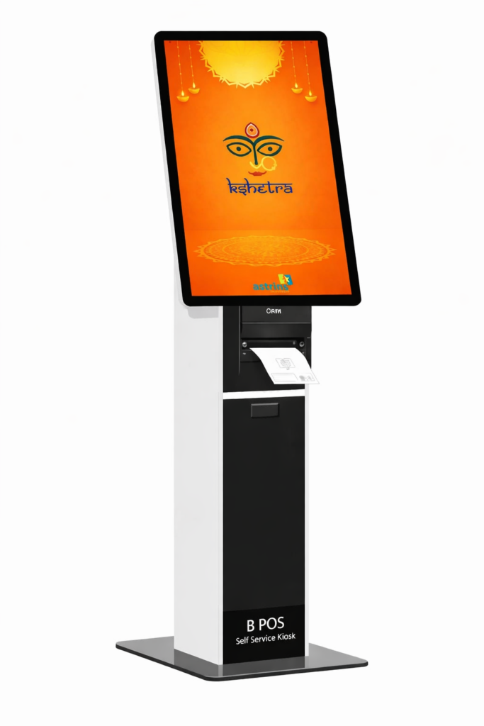 Transform your temple’s operations with the KSHETRA Self-Service KIOSK – an intelligent, touch-enabled solution by Astrins Technologies designed for efficient vazhipadu booking, secure digital payments, and instant receipt generation. Built for both devotees and administrators, it reduces queues, streamlines temple operations, and delivers a seamless digital experience.